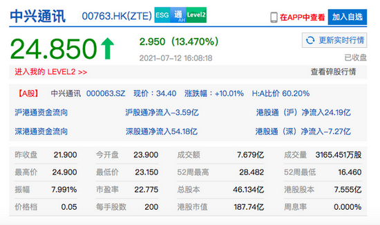 7月12日下午消息,香港恒生指数收涨0.62%,恒生科技指数涨1.14%,中兴通讯港股收涨超13%,报24.85港元每股,市值约187.7亿港元。此前,该公司发布公告称,上半年净利预增104.6%-131.52%。