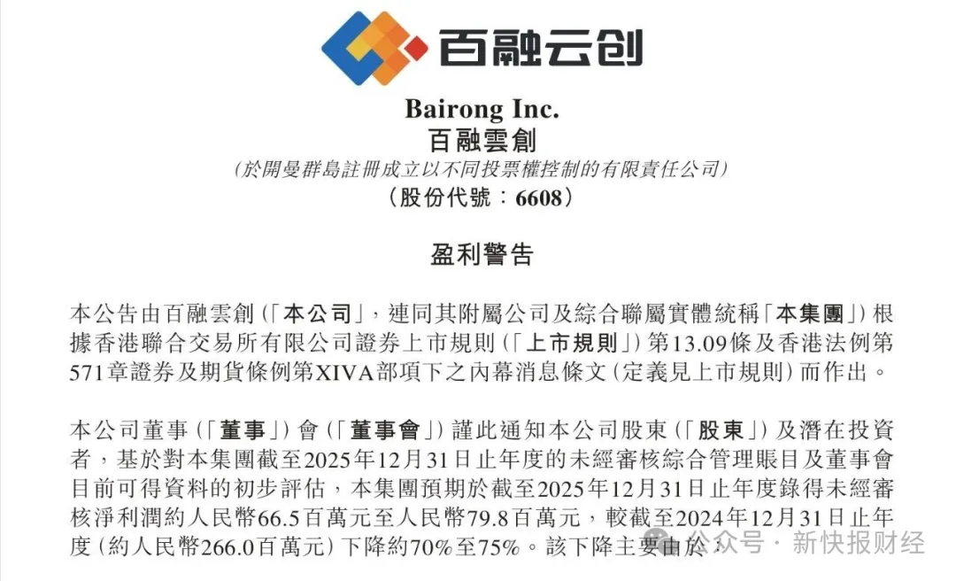 2月26日,百融云创发布盈利警告公告。公告显示,百融云创基于未经审核综合管理账目及董事会目前可得资料的初步评估,预计2025年全年未经审核净利润约为6650万元至7980万元,相较2024年下降约70%至75%。