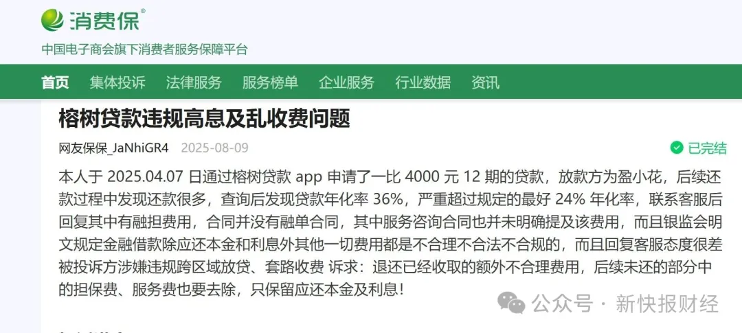 在第三方投诉平台上,有借款人表示,其于2025年4月通过榕树贷款申请了一笔4000元的贷款,分12期还款,放款方为盈小花。后续还款时发现该笔贷款年化利率为36%,联系客服后得知其中包含融担费用。