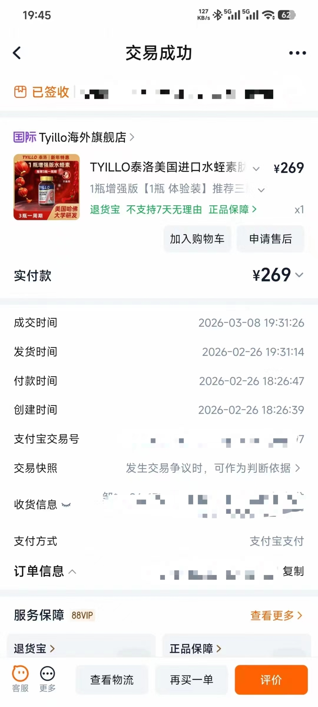 消费者购买YILLO泰洛美国进口水蛭素保健品的订单截图