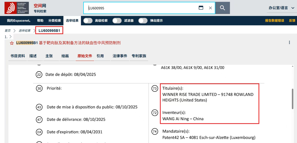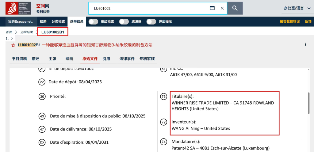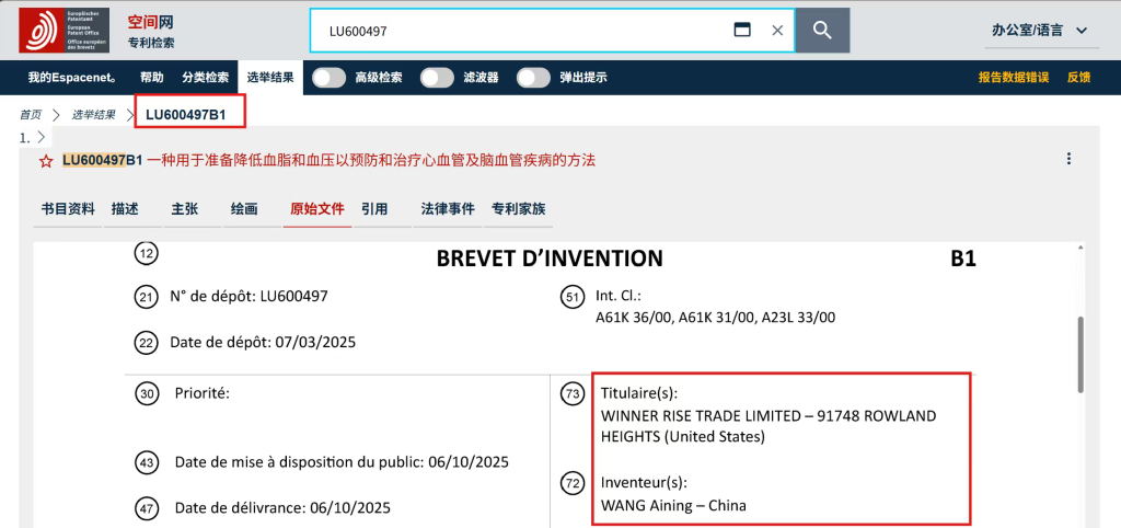 接到邹先生投诉后,澎湃新闻在欧洲专利局专利检索系统Espacenet上查到了商家公开的三个专利,均为在卢森堡知识产权局申请的专利,发明人为WANG AI NING,申请者为一家名叫WINNER RISE TRADE LTD的美国公司,并未出现与哈佛大学、兰迪·谢克曼等相关的字样。