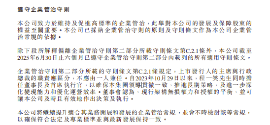 财报在“遵守企业管治守则”承认,公司偏离《香港联合交易所有限公司证券上市规则》附录C1《企业管治守则》第C.2.1条,该条款明确要求“上市发行人的主席与行政总裁的职责应区分,不应由一人兼任”。
