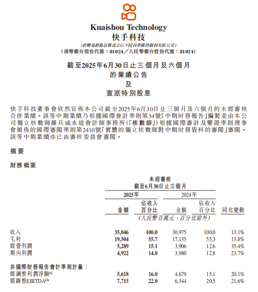 8月21日,快手科技发布2025年第二季度及中期业绩财报。以“经调整净利润56.18亿元创单季历史新高”“电商GMV同比增长17.6%”等亮眼数据引发市场关注。