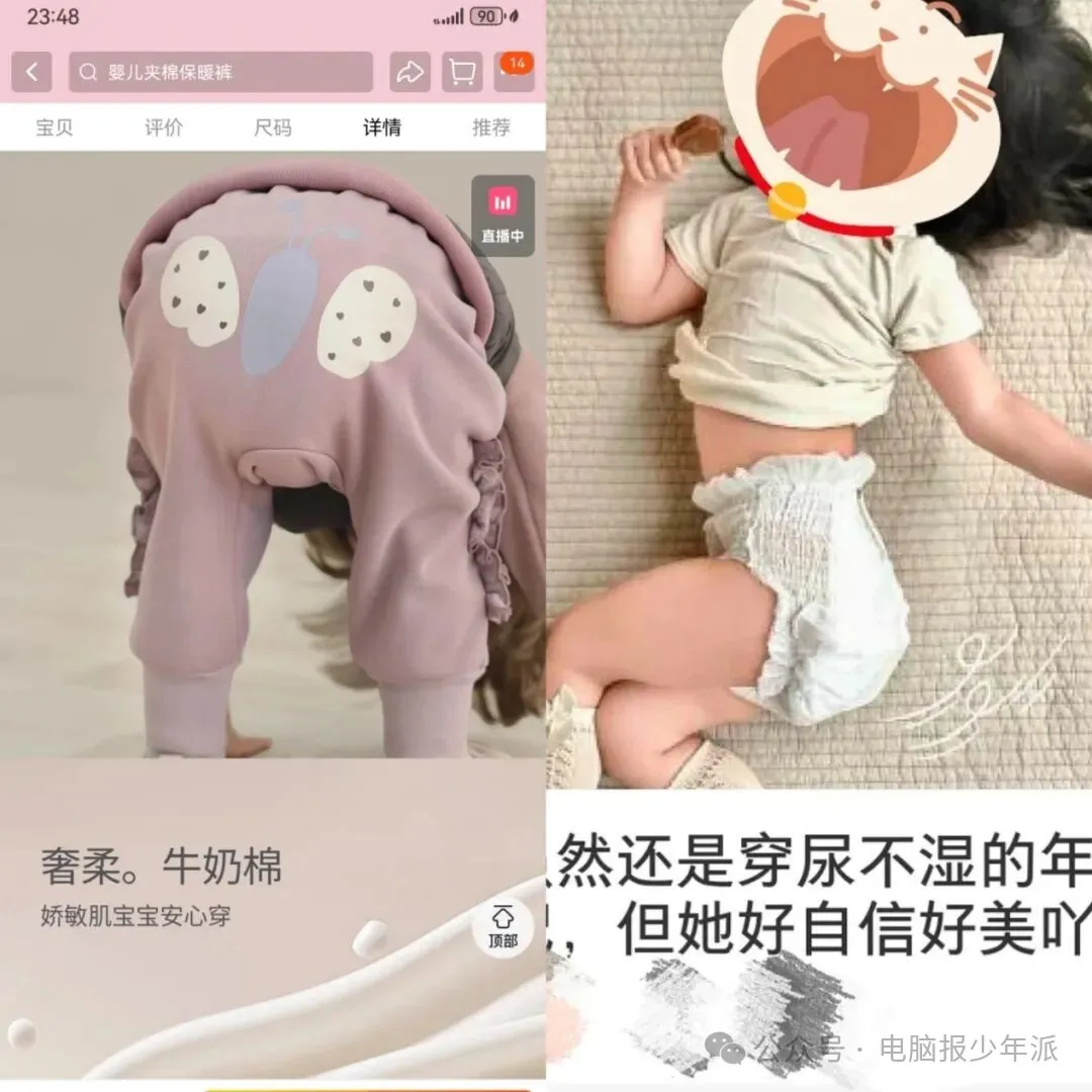 据网友反映,在一些童装的产品宣传页中,存在儿童模特穿着成人化性感服饰、用成熟姿势摆拍的情况,化妆、低胸、露腿,甚至刻意做出的暧昧表情等细节,带有明显的暗示意味。部分纸尿裤广告中也有近距离、大篇幅展示幼儿裸露身体的特写。因为这种引导,在商品评论区就有对这些图片开低俗玩笑的留言。