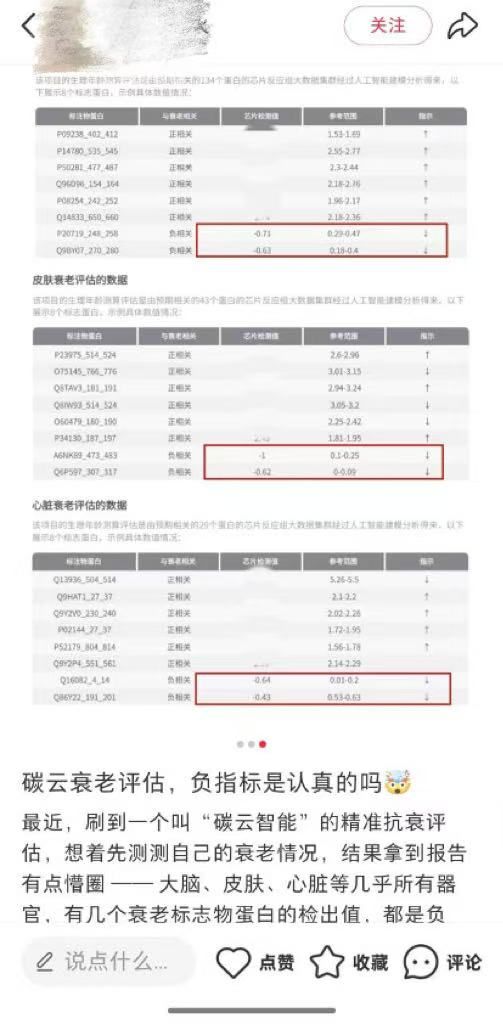 笔者出于好奇,在社交媒体搜索其99元基因检测,发现已有用户质疑其检测结果。小红书上,某位网友发布了碳云智能精准抗衰评估的内容。结果显示,他的大脑、皮肤、心脏等器官,好几个与衰老相关的标注物蛋白的“芯片检测值”竟然是负数。