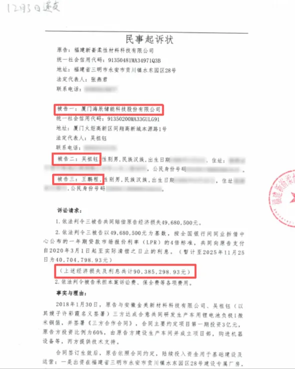 近期,厦门海辰储能科技股份有限公司(下称“海辰储能”)及创始人吴祖钰、王鹏程被福建新嵛柔性材料科技有限公司(下称“福建新嵛”)实控人张瑞明起诉,索赔金额合计约9038万元。