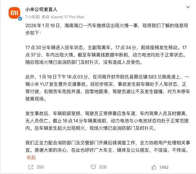 【TechWeb】1月20日消息,小米公司发言人通过官方账号发布通报,就1月19日小米汽车在海南海口、河南开封先后发生的两起火情事件进行说明。