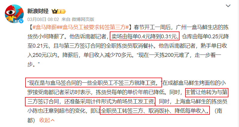 造成这种局面的原因或许与此前盒马员工“自爆”的内容有一定的关系:降低底薪、降低员工拣货单价、裁员、减员、重新签订合同、将正式员工的合同转为第三方合同,去除13薪、节假日3倍工资、五险一金等等。
