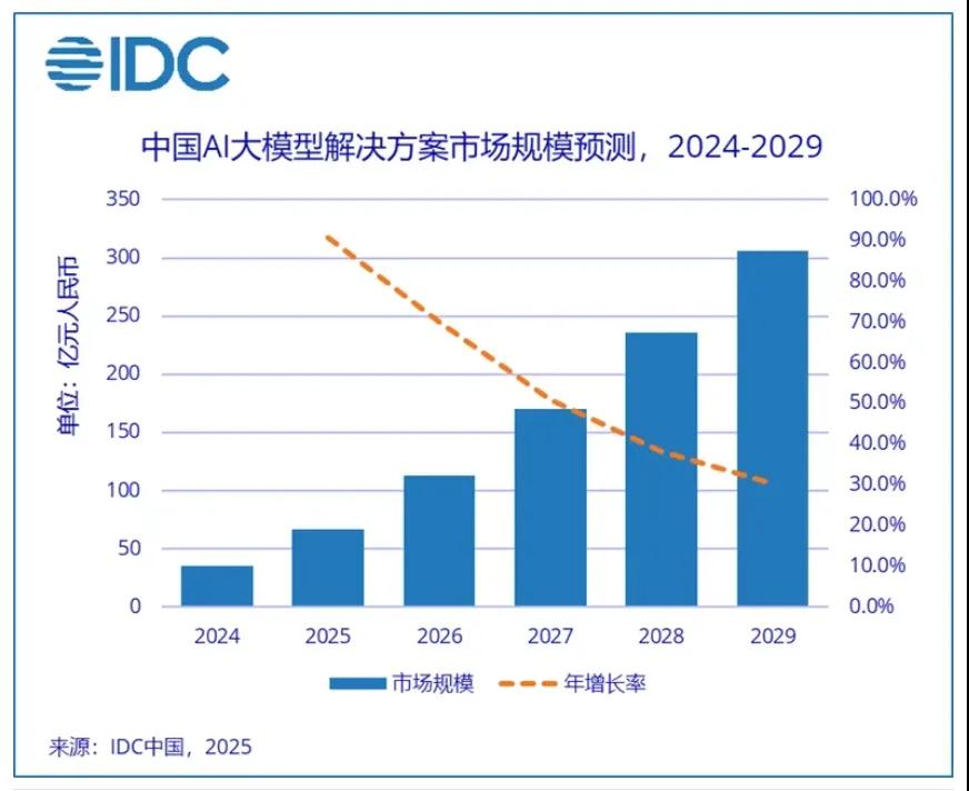 根据天眼查公开数据,及国际数据公司(IDC)最新发布的研究报告显示,2024-2029年中国模型即服务(MaaS)市场将以66.1%的年均复合增长率高速扩容,预计2029年市场规模将达到90亿元人民币。AI大模型解决方案市场同样保持高位增长态势,预计2029年整体规模达306亿元人民币。