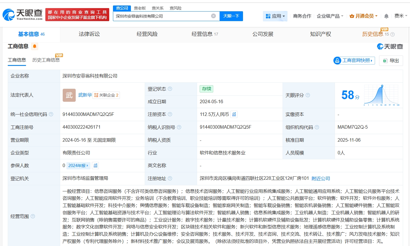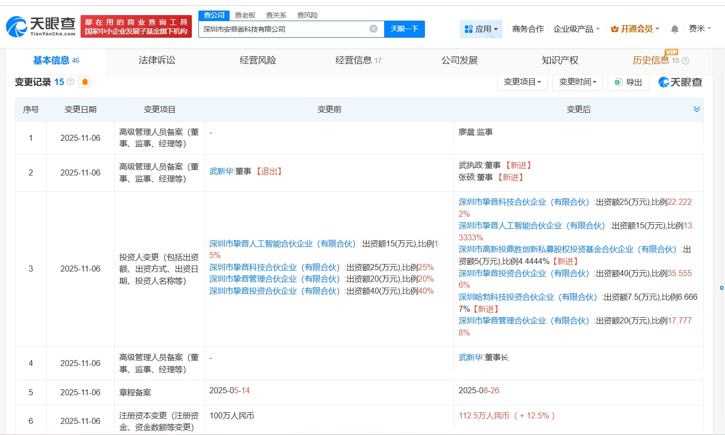 深圳市安菲翁科技有限公司成立于2024年5月,法定代表人为武新华,经营范围包括信息咨询服务、人工智能行业应用系统集成服务、人工智能通用应用系统等。股东信息显示,该公司现由深圳市挚音投资合伙企业(有限合伙)、深圳市挚音科技合伙企业(有限合伙)及上述新增股东等共同持股。公开资料显示,该公司是一家专注于语音AI大模型领域的高科技企业。