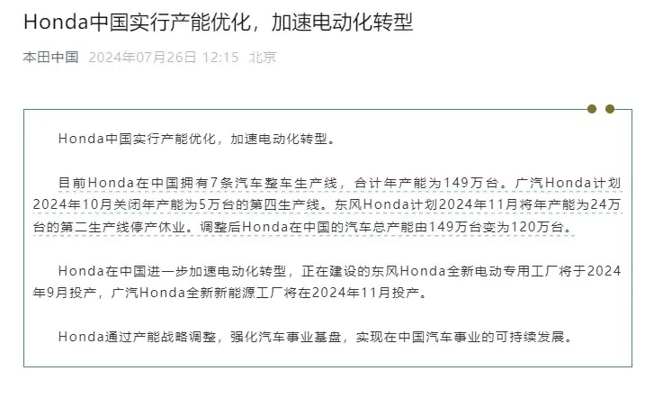 在传出本田要关闭两条生产线的第二天,本田中国就在官方公众号中确认了此事。广汽本田将在今年10月关闭年产能5万辆的第四生产线,而东风本田将在今年11月关闭年产能24万辆的第二生产线,此后本田在中国的年总产能从149万辆变为120万辆,下降19.46%。
