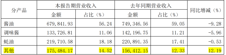 这一现象我们能在今年已披露的半年度业绩报告中窥见一二。数据显示,海天味业在“其他调味品”的综合营收为17.55亿元,占总营收比重仅为14.52%,并没有跑出足以支撑业绩的第二增长曲线。