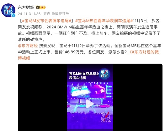 11月3日,多名网友发视频称,2024 BMW M热血嘉年华热血之夜上,两辆表演车发生追尾事故。