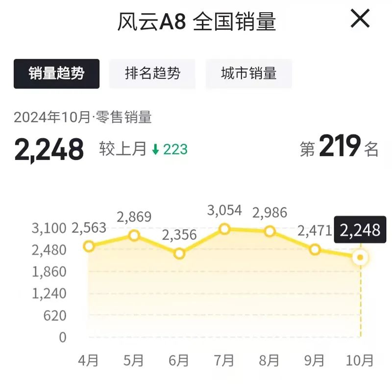 而根据最新的数据显示,2024年10月份,奇瑞风云A8的销量为2248辆,相比今年9月份的销量2471辆,环比下滑9.0%,同时今年8月份开始,奇瑞风云A8已经连续三个月出现不同程度的环比下滑。