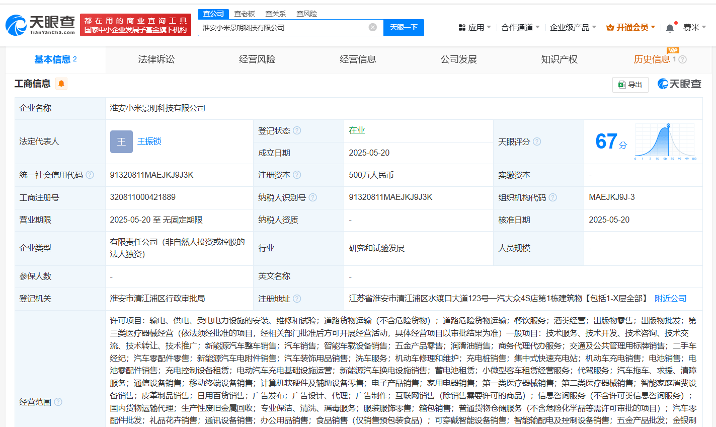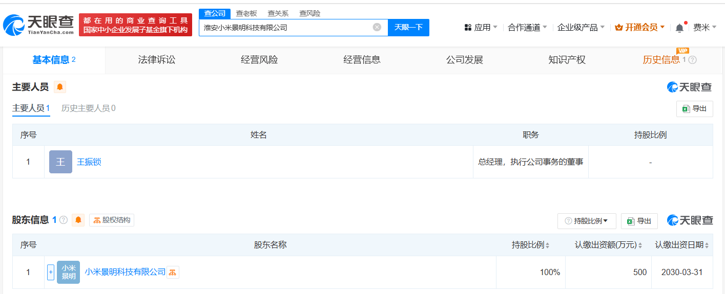 天眼查App显示,近日,淮安小米景明科技有限公司成立,法定代表人为王振锁,注册资本500万人民币,经营范围包括新能源汽车整车销售、道路危险货物运输、餐饮服务、酒类经营、智能车载设备销售、五金产品零售等,由小米集团旗下小米景明科技有限公司全资持股。