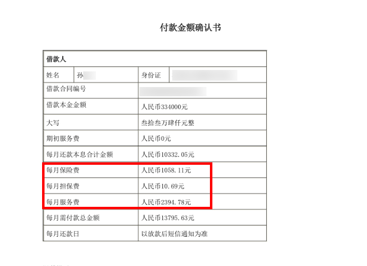 据了解,孙女士因为置换房产,通过平安普惠贷出33.4万,分36期还清。根据孙女士提供的合同显示,每月需还款本息10332.05元,此外,孙女士每月还需支付服务费2394.78元、担保费10.69元,以及1058.11元的保险费。按照36期算下来,仅保险费,就要支付38091.96元。孙女士认为这不合理,遂要求提请结清。经过多次协商,平安普惠终于答应孙女士的请求,但需要支付10020元的提前结清费用。
