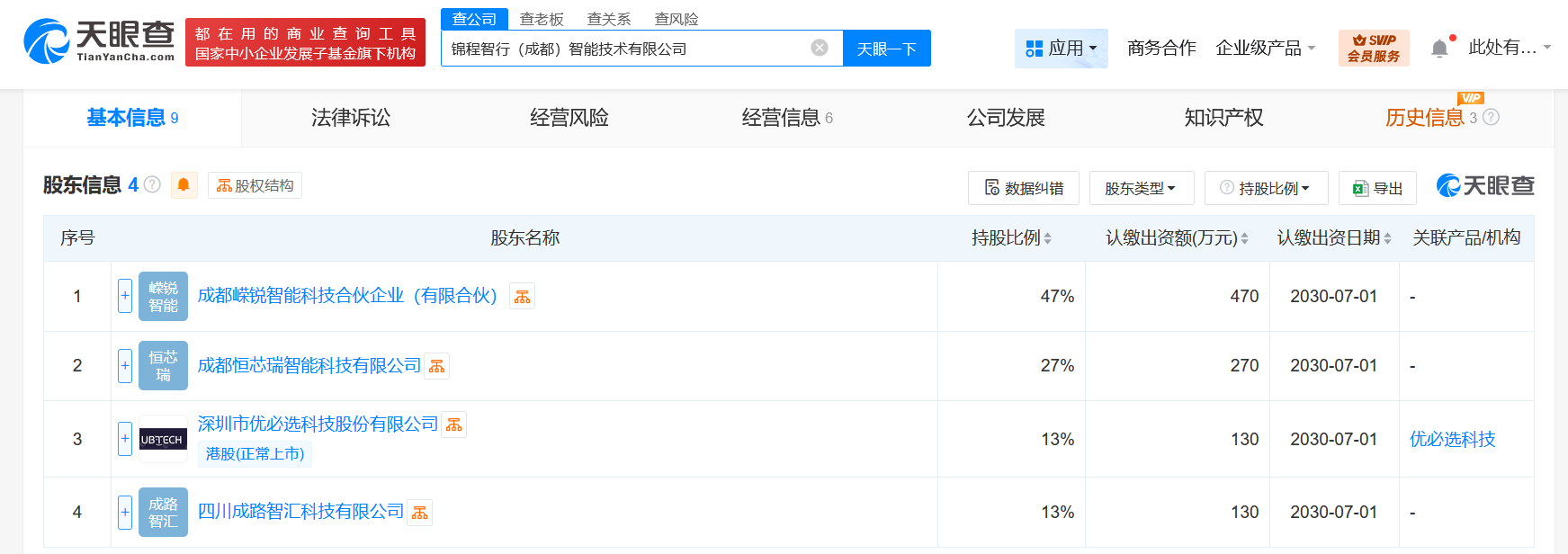 天眼查App显示,近日,锦程智行(成都)智能技术有限公司成立,法定代表人为黄海艳,注册资本1000万人民币,经营范围含智能机器人的研发、智能机器人销售、人工智能理论与算法软件开发、人工智能应用软件开发、人工智能公共数据平台、人工智能通用应用系统、信息技术咨询服务、信息系统集成服务等。股东信息显示,该公司由成都嵘锐智能科技合伙企业(有限合伙)、成都恒芯瑞智能科技有限公司、优必选(09880.HK)、四川成路智汇科技有限公司共同持股。