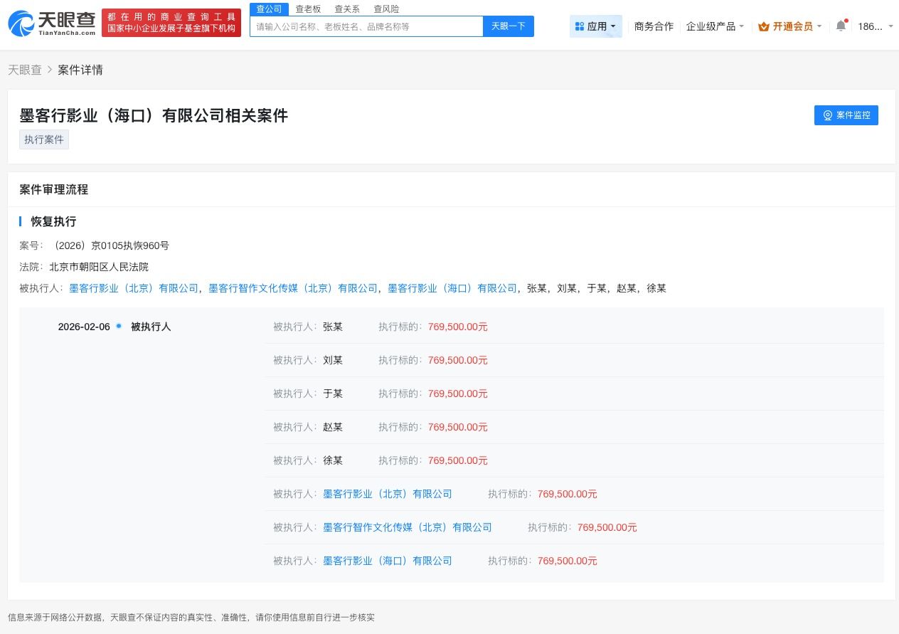 天眼查天眼风险信息显示,近日,于谦、墨客行影业(北京)有限公司等新增一则恢复执行信息,执行标的76.95万元,执行法院为北京市朝阳区人民法院。