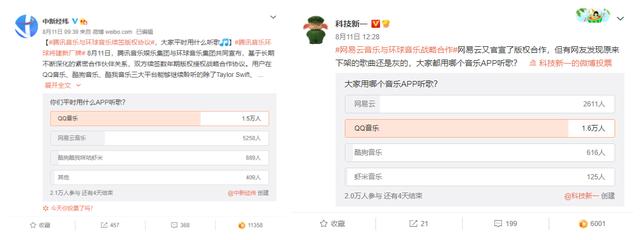 8月11日,网易云音乐和腾讯音乐同时官宣和环球音乐达成版权合作,想象中的“集体倒戈”却并未出现,反倒是占到大多数的网友对此反应冷淡。微博上有人做了投票调查,结果显示,QQ音乐的支持者更多,这倒是和前几年的情况形成了强烈反差。
