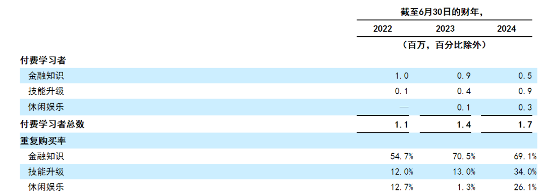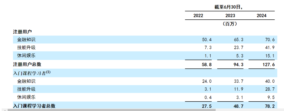 不过,金融知识用户情况就不太乐观了,2022财年时,量子之歌金融知识注册用户5040万,付费学习者100万,付费学习者占注册用户1.98%,2024财年时,金融知识注册用户达7060万,而付费学习者是50万,付费学习者占注册用户0.71%,已经不足2022年的一半。