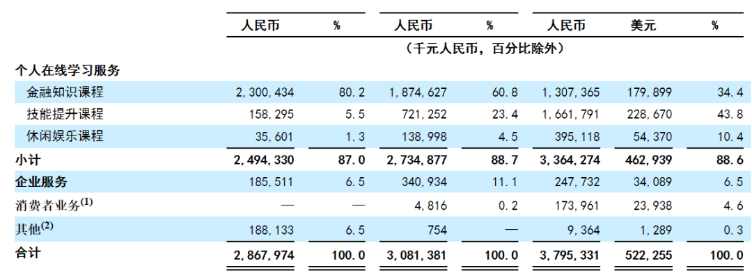 其中,金融知识课程营收达13.07亿元,同比下降30.26%;技能提升课程营收16.62亿元,同比增长130.4%;休闲娱乐课程营收3.95亿元,同比增长184.26%。