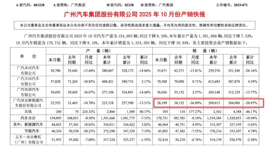 广汽集团公布的产销快报显示,2025年10月,广汽埃安销量仅为28,199辆。这个数字,与去年同期38,152 辆的业绩相比,下跌了26.09%,而2023年同期时,这一数字还是41,503辆。与此同时,今年1-10月,广汽埃安累计销量仅为264,900辆,同比下滑20.87%,仅为2023年同期销量(392,489辆)的67.49%。