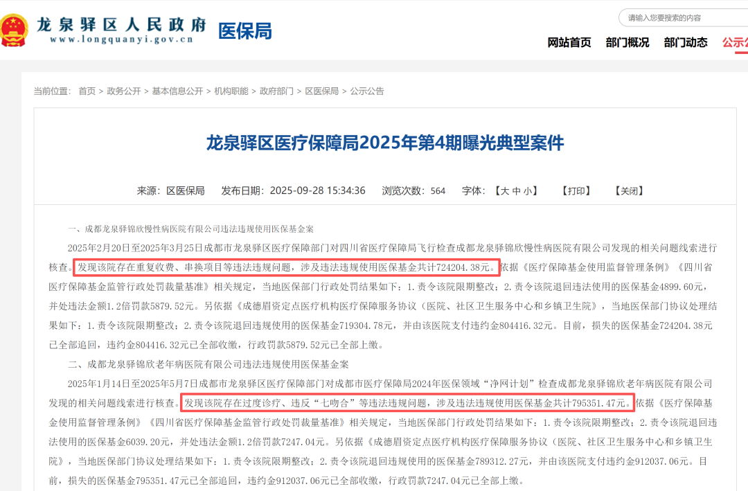 2025年1月至5月,成都龙泉驿锦欣老年病医院有限公司存在过度诊疗、违反“七吻合”等违法违规问题,涉及违法违规使用医保基金共计795351.47元。2025年2月至3月,成都龙泉驿锦欣慢性病医院有限公司存在重复收费、串换项目等违法违规问题,涉及违法违规使用医保基金共计724204.38元。