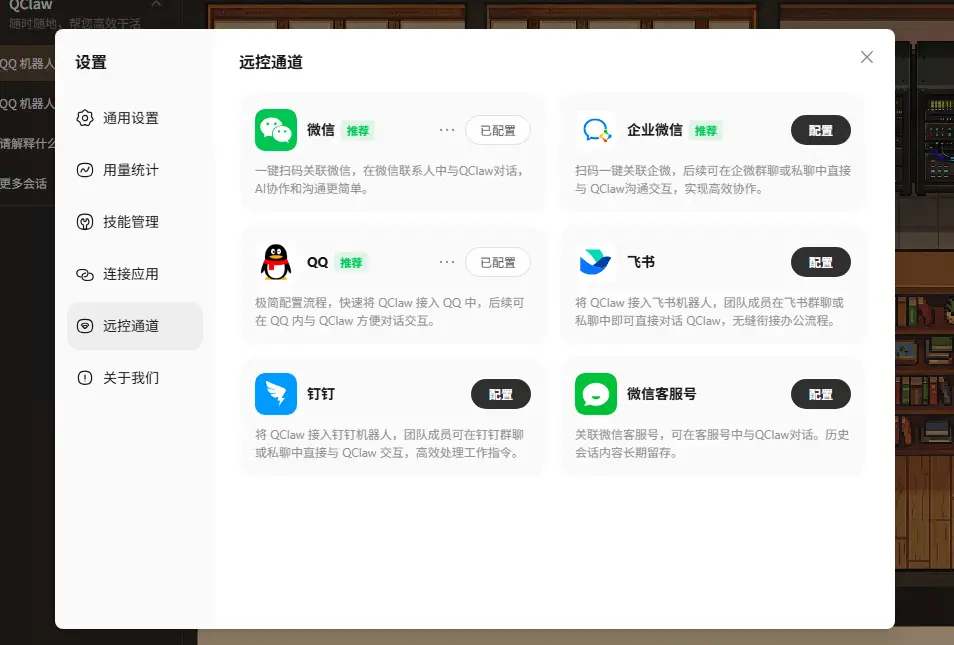更匪夷所思的是,Qclaw直接在界面提供了飞书、钉钉的快捷配置通道。