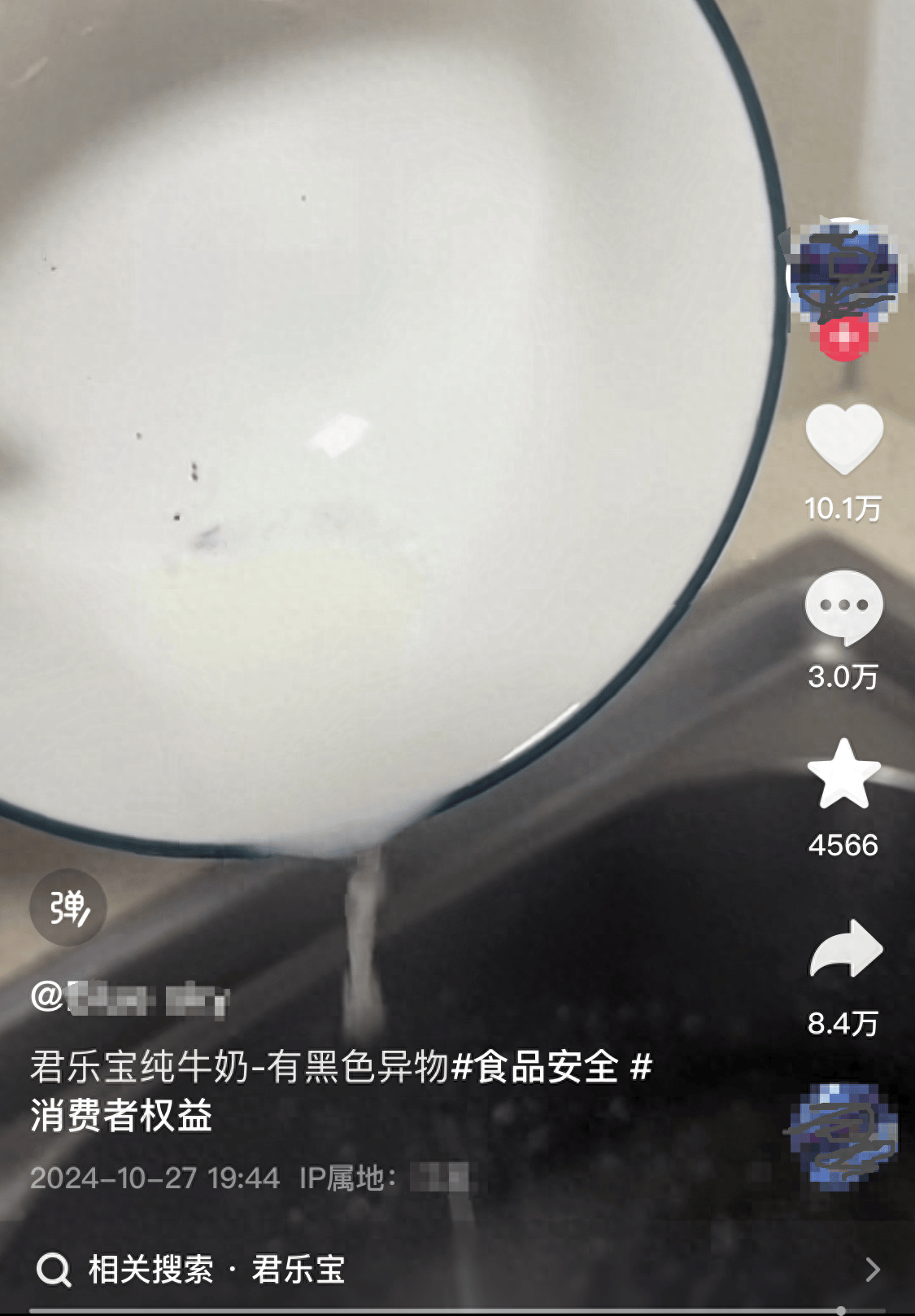 君乐宝一款纯牛奶受质疑,消费者称发现黑色异物并送检快讯