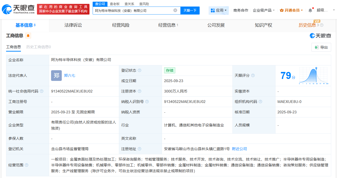 天眼查App显示,近日,阿为特半导体科技(安徽)有限公司成立,法定代表人为郑六七,注册资本3000万人民币,经营范围包括金属表面处理及热处理加工、半导体器件专用设备制造、半导体器件专用设备销售等。