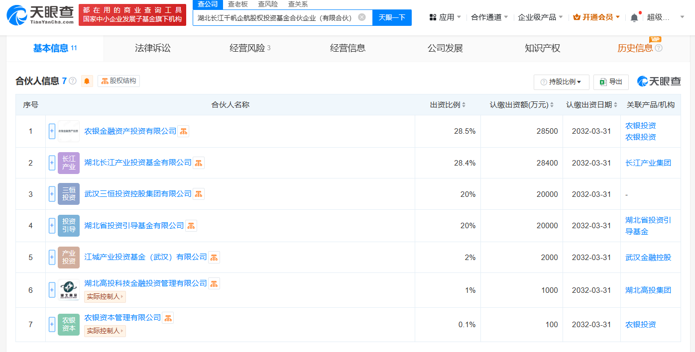 天眼查App显示,近日,湖北长江千帆企航股权投资基金合伙企业(有限合伙)成立,执行事务合伙人为湖北高投科技金融投资管理有限公司、农银资本管理有限公司,出资额10亿人民币,经营范围为创业投资。合伙人信息显示,该基金由农银金融资产投资有限公司、湖北长江产业投资基金有限公司、湖北省投资引导基金有限公司等共同出资。