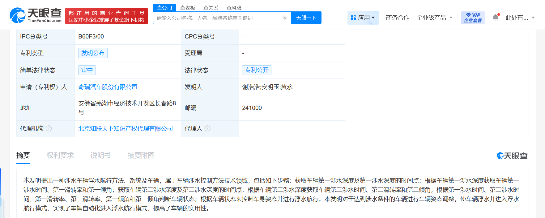 天眼查App显示,近日,奇瑞汽车股份有限公司申请的“一种涉水车辆浮水航行方法、系统及车辆”公布。