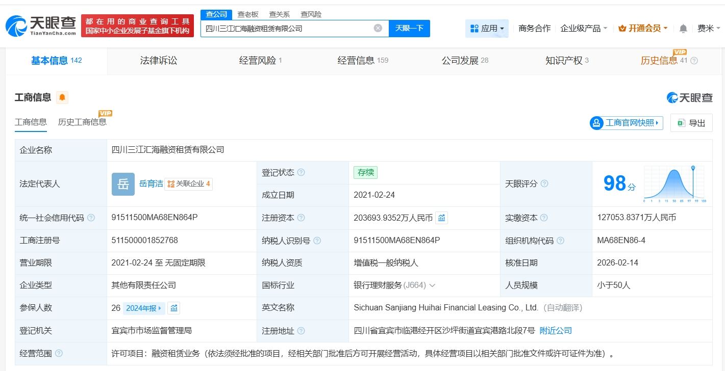 五粮液集团入股四川三江汇海融资租赁公司 后者增资至约20.4亿观点