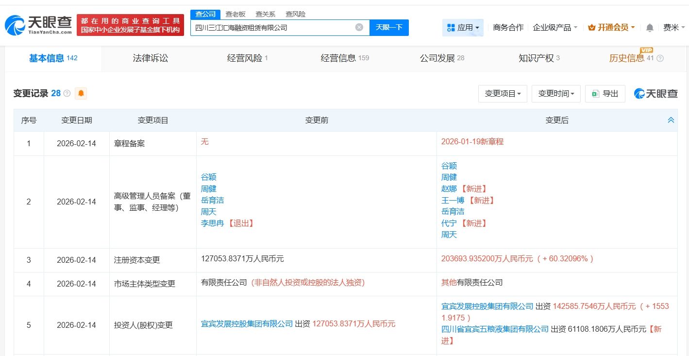 天眼查App显示,近日,四川三江汇海融资租赁有限公司发生工商变更,新增四川省宜宾五粮液集团有限公司为股东,同时,注册资本由约12.7亿人民币增至约20.4亿人民币,增幅约60%。