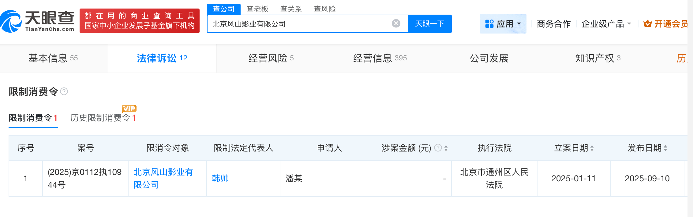 天眼查天眼风险信息显示,近日,北京风山影业有限公司及该公司法定代表人韩帅新增一则限制消费令,涉及潘某某与该公司相关合同纠纷案件,执行法院为北京市通州区人民法院。