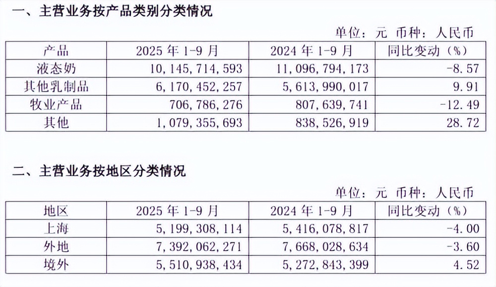 其中,作为公司第一大营收来源的液态奶,面临更为严峻的挑战。2022年—2024年及2025年上半年,公司液态奶营收持续下滑。2025年前三季度,公司液态奶收入同比下滑8.57%至101.46亿元。