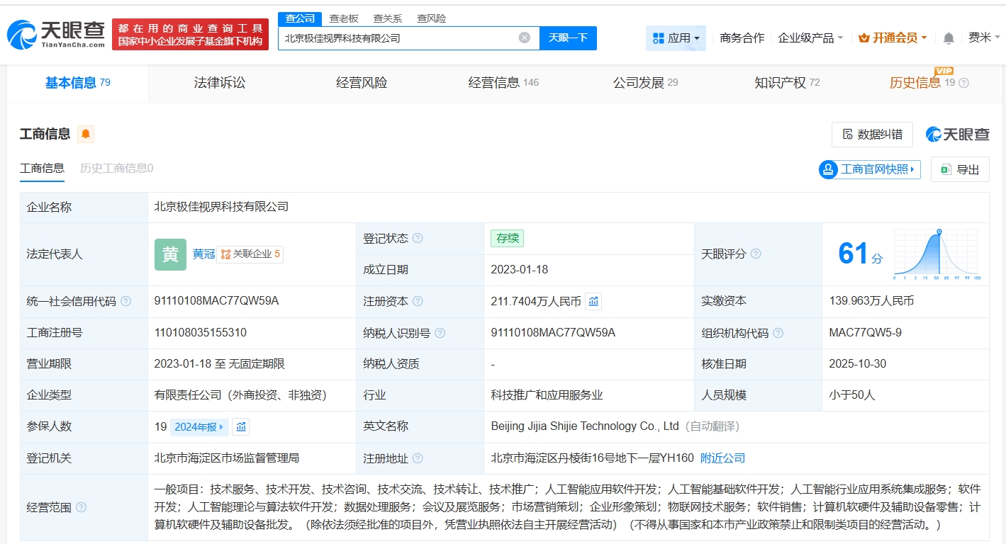 北京极佳视界科技有限公司成立于2023年1月,法定代表人为黄冠,经营范围包括人工智能应用软件开发、人工智能基础软件开发、人工智能行业应用系统集成服务等。股东信息显示,该公司现由黄冠、宁波辰韬智驾股权投资基金合伙企业(有限合伙)及上述新增股东等共同持股。官网显示,该公司是一家专注于视频生成和世界模型技术的空间智能公司。