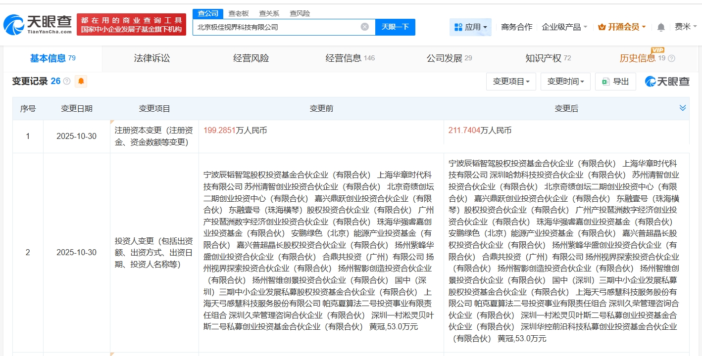 天眼查工商信息显示,近日,北京极佳视界科技有限公司发生工商变更,新增华为旗下深圳哈勃科技投资合伙企业(有限合伙)、深圳华控前沿科技私募创业投资基金合伙企业(有限合伙)为股东,同时注册资本由约199.3万人民币增至约211.7万人民币。