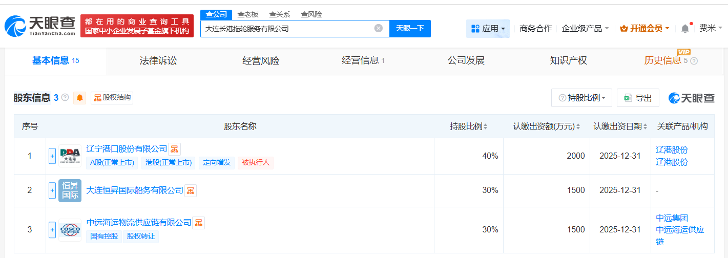 天眼查App显示,近日,大连长港拖轮服务有限公司成立,法定代表人为冷冰述,注册资本5000万人民币,经营范围包括国内船舶管理业务、船舶修理、港口经营等。股东信息显示,该公司由辽港股份(601880)、大连恒昇国际船务有限公司、中远海运物流供应链有限公司共同持股。
