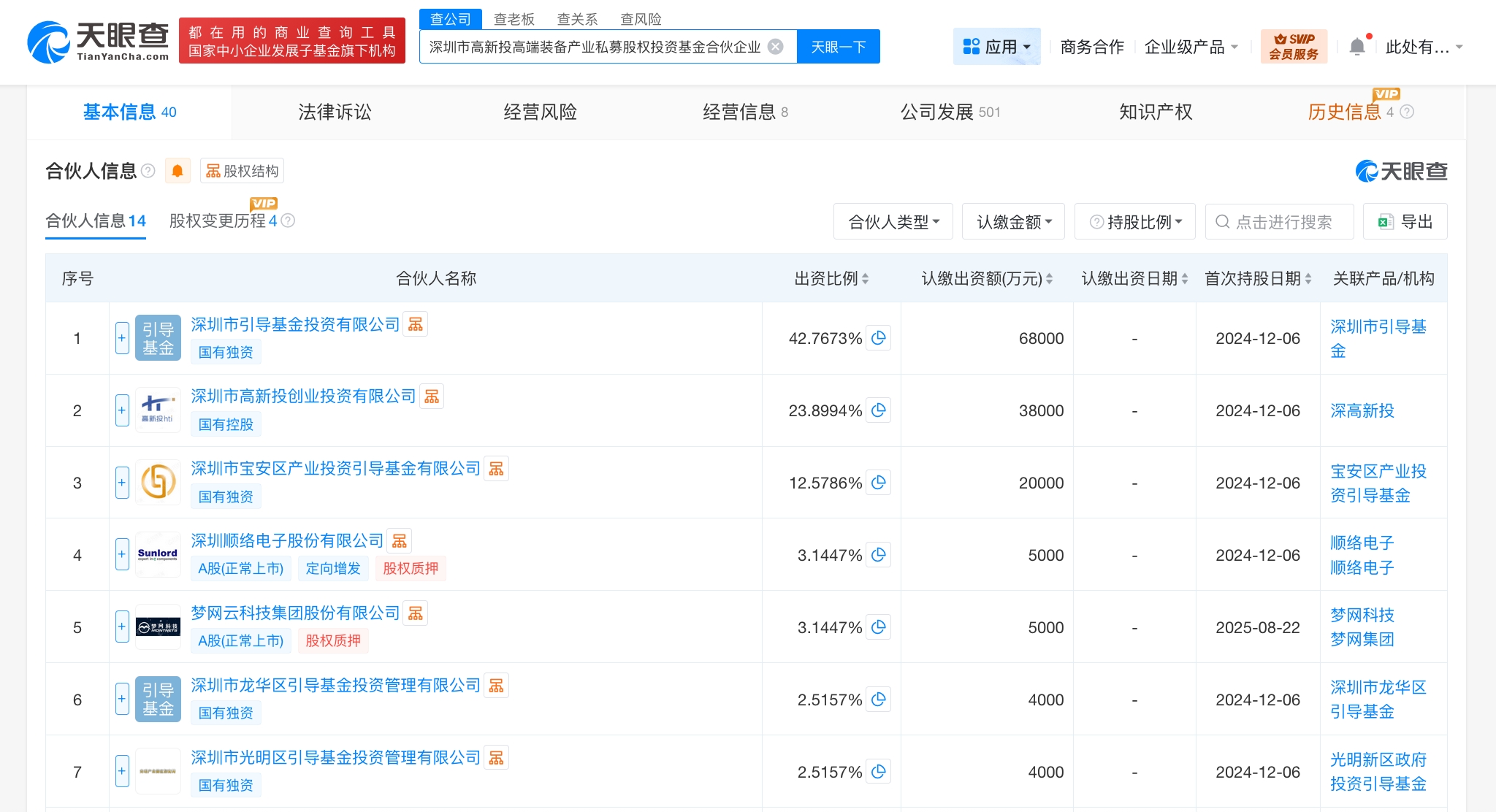 深圳市高新投高端装备产业私募股权投资基金合伙企业(有限合伙)成立于2024年12月,执行事务合伙人为深圳市高新投人才股权投资基金管理有限公司,经营范围为以私募基金从事股权投资、投资管理、资产管理等活动。合伙人信息显示,该基金现由深圳市引导基金投资有限公司、深圳市高新投创业投资有限公司、顺络电子(002138)及上述新增合伙人等共同出资。
