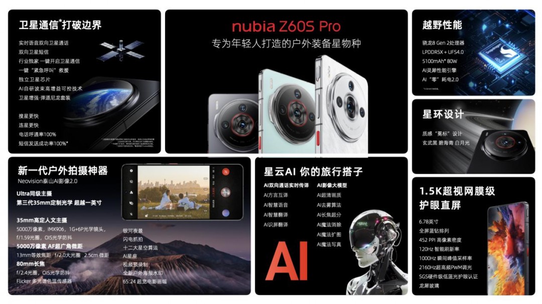 努比亚Z60S Pro搭载Neovision泰山AI影像2.0,物种 努比亚Z60S Pro搭载双向卫星通信,AI+卫星通信 户外装备。