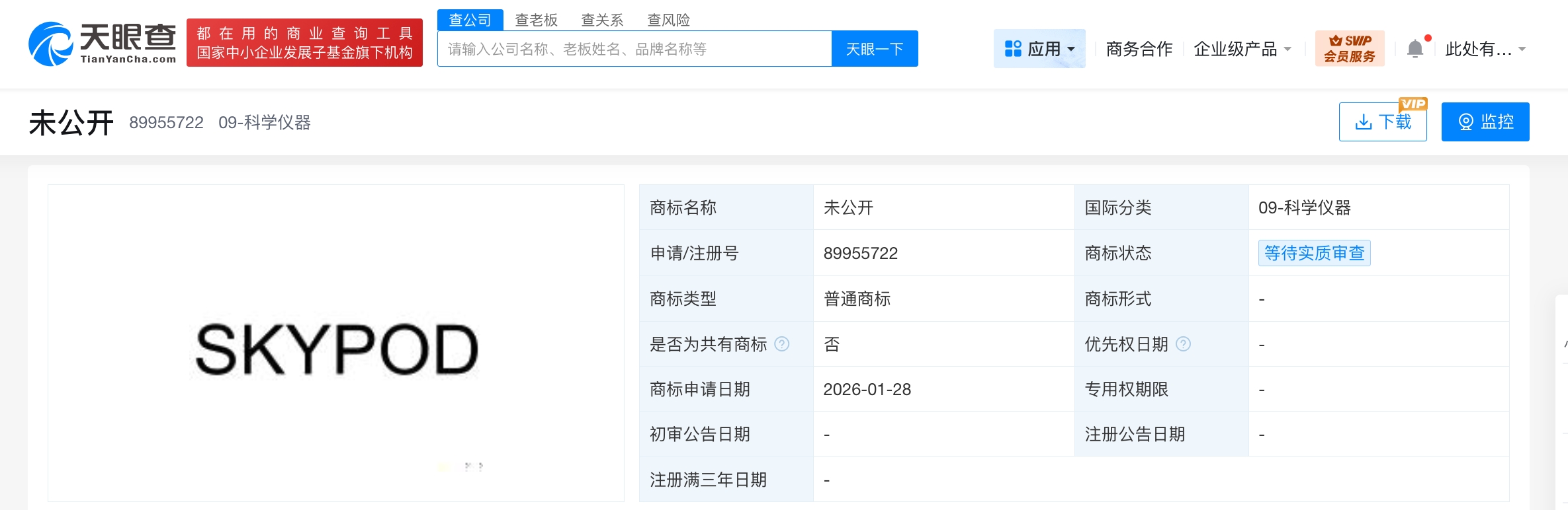 天眼查知识产权信息显示,近日,苹果公司申请注册一枚“SKYPOD”商标,国际分类为科学仪器,当前商标状态为等待实质审查。