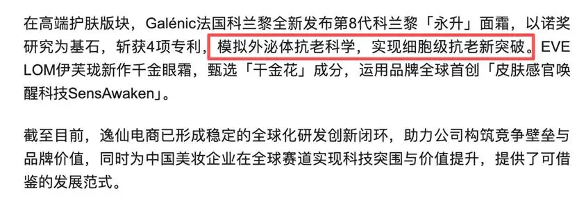 在逸仙电商2025年第四季度财报中,“Galénic 法国科兰黎全新发布第8代科兰黎「永升」面霜,以诺奖研究为基石,斩获4项专利,模拟外泌体抗老科学,实现细胞级抗老新突破”跃然纸上,这一表述出现在逸仙电商官方财报中,也显示了公司对这一宣传话术的认可。