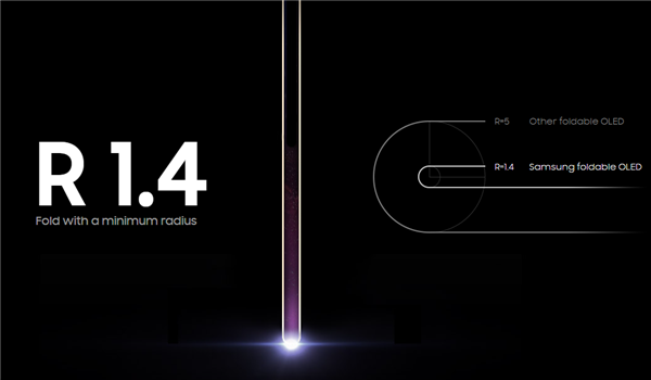 至于屏幕的曲率,三星公布的细节显示,可以做到1.4R(1.4mm)的折叠半径,这样的好处是,减低铰链的设计难度,降低成本的同时,也能让折叠压力降至最低。