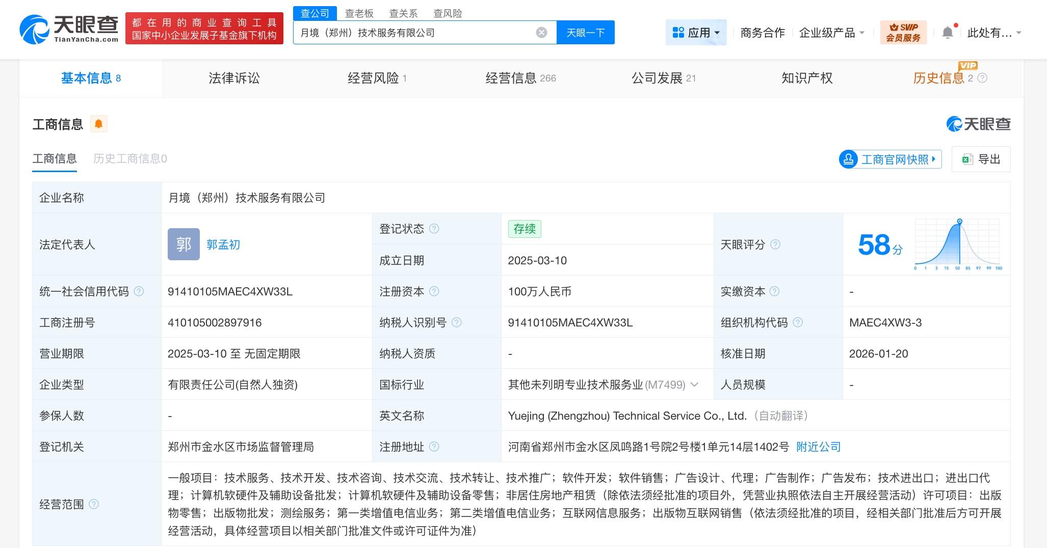 月境(郑州)技术服务有限公司成立于2025年3月,法定代表人为郭孟初,经营范围含软件开发、软件销售、计算机软硬件及辅助设备批发、计算机软硬件及辅助设备零售、互联网信息服务、出版物互联网销售等。股东信息显示,该公司由郭孟初全资持股。