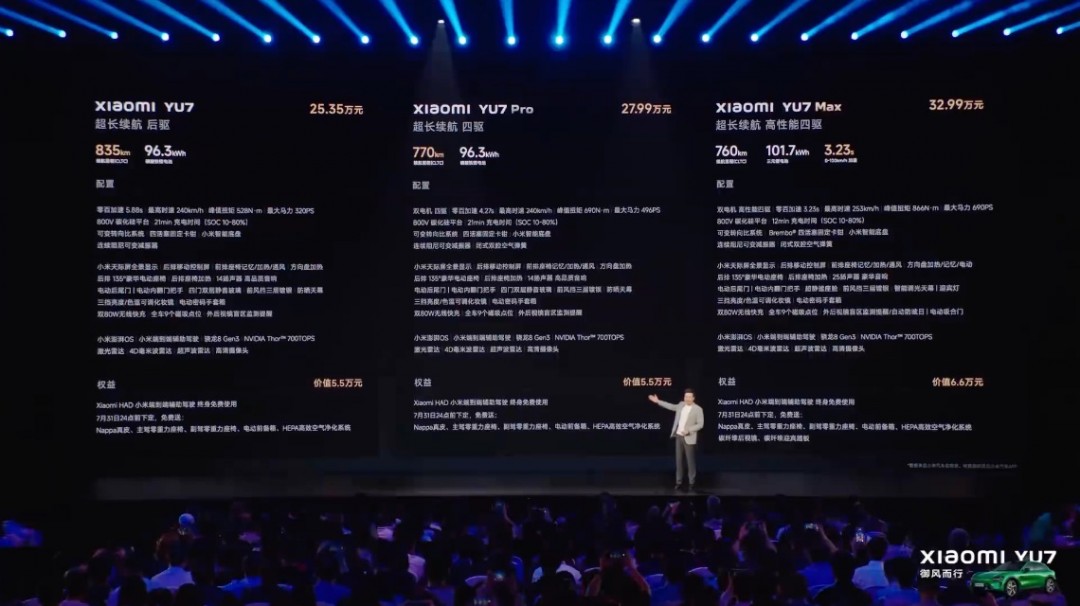 此外,雷军还给到了首批用户非常有诚意的购车权益:在7月31日24:00前下定,赠送电动前备箱、主副驾零重力座椅、Nappa真皮座椅、HEPA高效空气净化系统和Xiaomi HAD;Max版还赠送价值1.1万元的专属的碳纤维迎宾踏板和碳纤维后视镜。