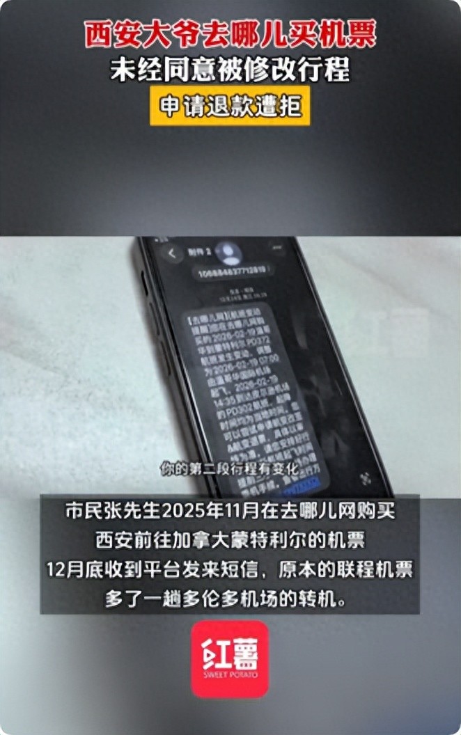 据报道,2025年11月,西安市民张先生通过去哪儿网购买了从西安飞往加拿大蒙特利尔的联程机票。然而,12月底他收到平台短信通知,原定行程被更改:多出一站在多伦多转机。