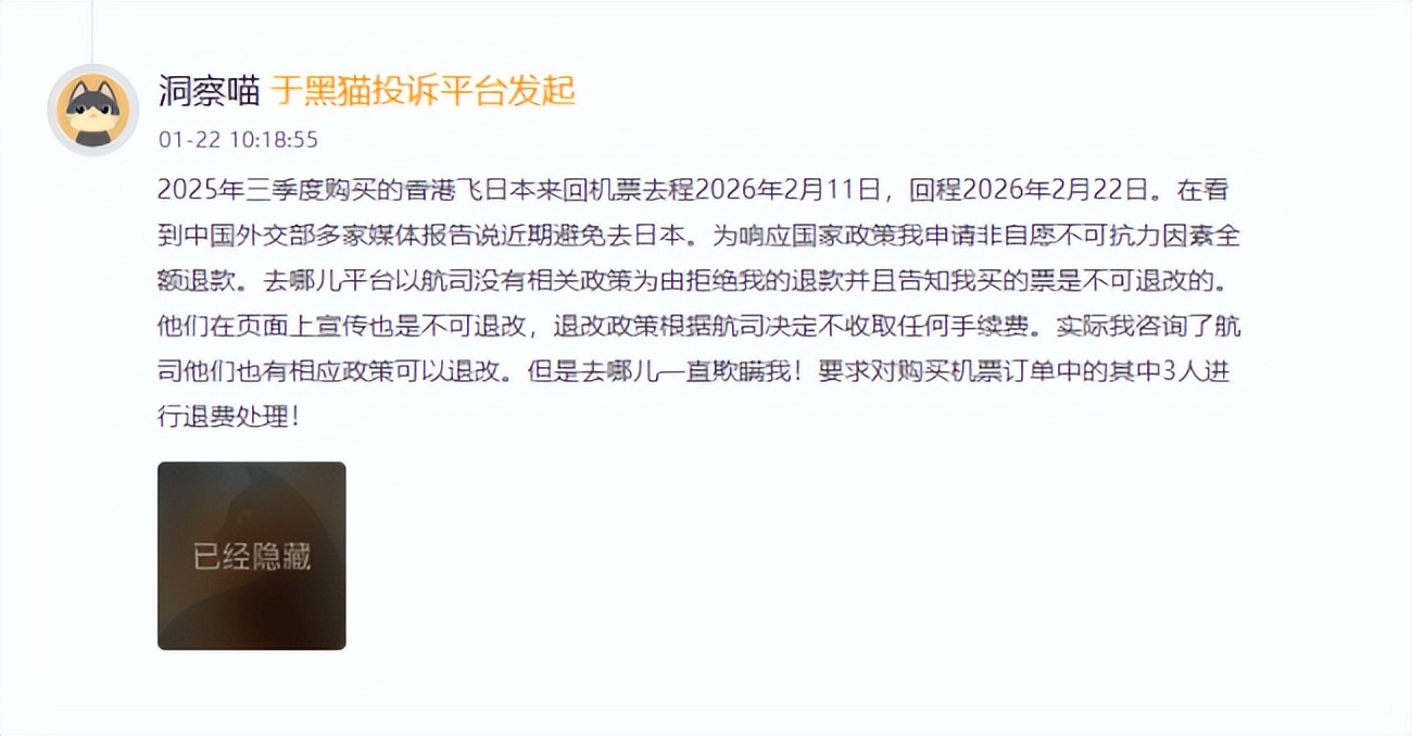 另有用户反映,因政策变化申请退票却被平台无理拒绝。该用户购买了三张2026年2月香港往返日本的机票,后因外交部提醒公民近期避免赴日,提出以不可抗力因素全额退票。然而去哪儿网声称航司无相关政策而拒绝退款,并坚持机票“不可退改”的原有条款。消费者随后咨询航空公司,发现航司实际上有相应退改政策,质疑去哪儿平台存在隐瞒真实退改规定、欺瞒消费者的行为。