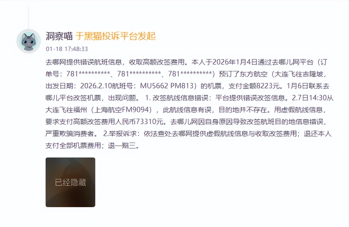 有用户投诉称,通过去哪儿网改签机票时,平台提供了错误的航班信息并索要巨额费用。其于2026年1月4日预订了3张大连飞吉隆坡的机票并支付8223元,改签时平台给出的新航班目的地竟是不存在的城市,并要求支付高达7.33万元的改签费。如此离谱的错误与收费,令消费者怀疑平台系统或人工存在重大纰漏乃至涉嫌故意欺诈。