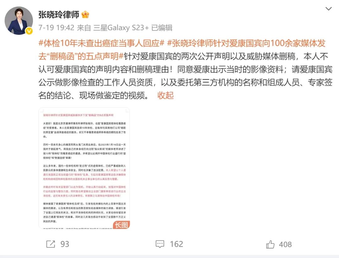 不过,张女士并未等到对方提供的相关证明文件。7月14日,她通过媒体发声,质疑爱康国宾体检涉嫌误检和漏检。